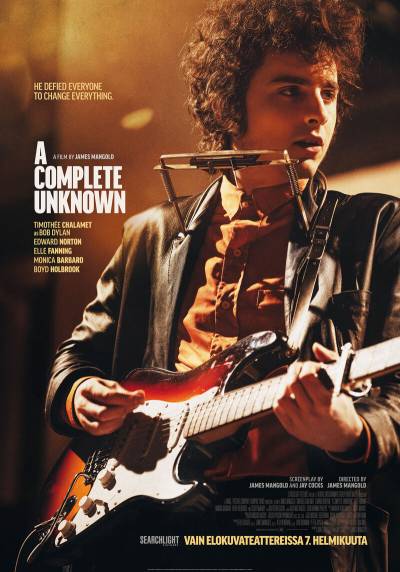 New Yorkin vaikutusvaltaiseen musiikkiskeneen 60-luvun alussa sijoittuva A COMPLETE UNKNOWN seuraa 19-vuotiaan minnesotalaisen muusikon Bob Dylanin (Timothée Chalamet) rakettimaista nousua folklaulajasta isoihin konserttisaleihin ja listojen kärkeen – hänen laulujensa ja mystiikkansa muodostuttua maailmanlaajuiseksi ilmiöksi – ja huipentuu hänen käänteentekevään esiintymiseensä vuoden 1965 Newportin folkfestivaaleilla rokkibändin ja sähköisten instrumenttien säestyksellä.