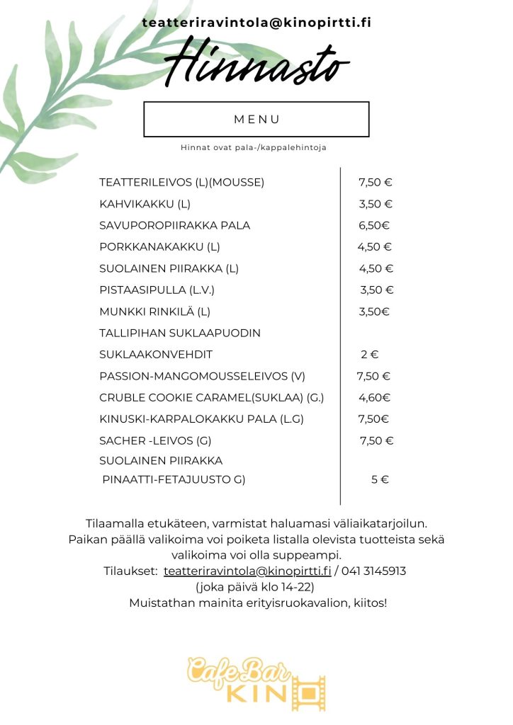 - Ennakkoon sähköpostitse teatteriravintola@kinopirtti.fi